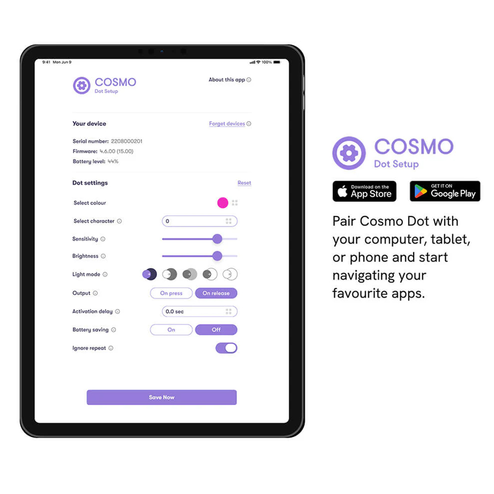 Access to the Cosmo Dot App (iPad and iPhone) for settings and key mapping. Also available on Android devices.