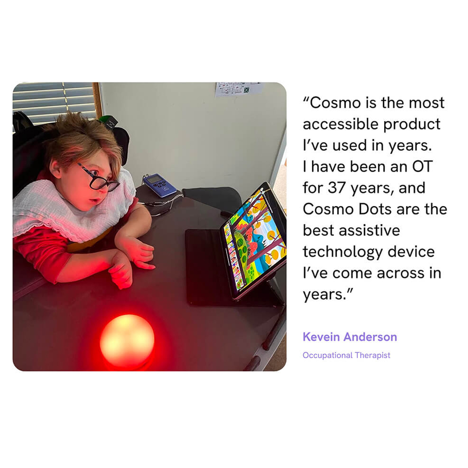 You can use the Cosmo Dot in two ways. Use it on its own as a standalone accessibility switch for simple, motivating access to devices and apps, or combine several Cosmo Dots within the Cosmo Learning System App to gain access to evidence-based activities that support cognitive, motor, social and emotional skills.
